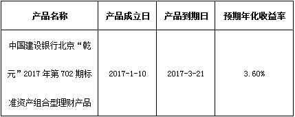 关于中国建设银行北京“乾元”2017年第702期标准资产组合型理财产品成立的公告