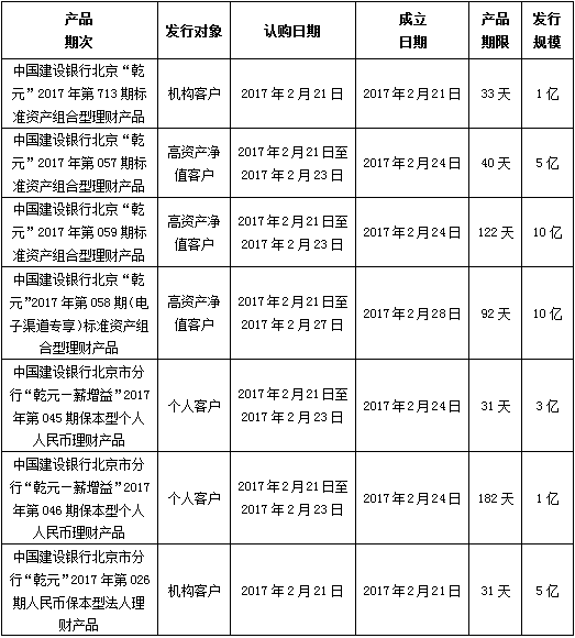 中国建设银行北京市分行定于2017年2月21日发行理财产品,现将相关发行情况公告如下:
