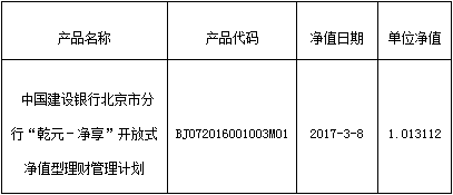 中国建设银行北京市分行“乾元-净享”开放式净值型理财管理计划净值公布如下: