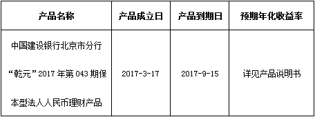 关于中国建设银行北京市分行“乾元”2017年第043期保本型法人人民币理财产品成立的公告
