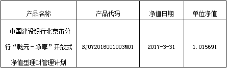 中国建设银行北京市分行“乾元-净享”开放式净值型理财管理计划净值公告