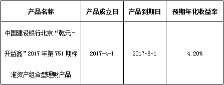 关于中国建设银行北京“乾元-升益鑫”2017年第751期标准资产组合型理财产品成立的公告