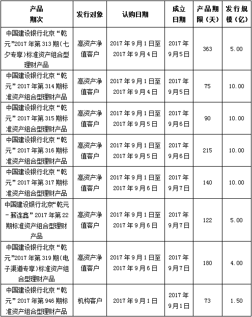 中国建设银行北京市分行定于2017年9月1日发行理财产品,现将相关发行情况公告如下: