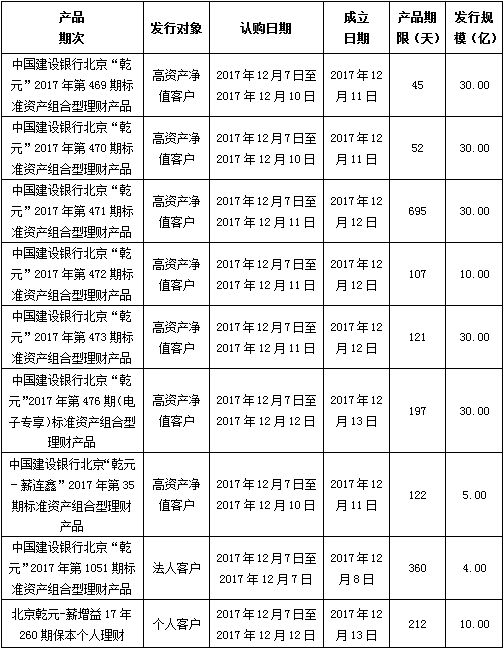 建行北京市分行理财产品发行公告2017年12月7日