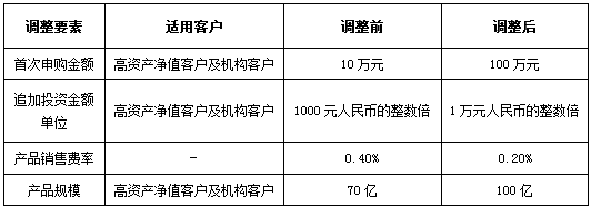 高资产净值客户新预期年化收益率及其他产品要素调整于2018年1月24日(含)起执行。对于2018年1月24日(不含)前已经购买成功且未赎回的所有存量高资产净值客户投资本金,按照实际持有天数,其中2018年1月24日(不含)前持有部分执行原客户预期年化收益率,2018年1月24日(含)后持有部分自动执行新高资产净值客户预期年化收益率,但以最终支付的实际年化收益率为准。