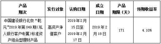 中国建设银行北京市分行定于2019年2月15日发行理财产品,现将相关发行情况公告如下: