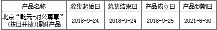 “乾元-对公尊享”(按日开放)人民币非保本理财产品于2018年9月25日正式成立。截至报告日,本产品规模为1,600,000,000.00元。