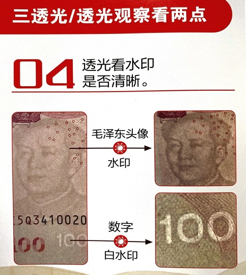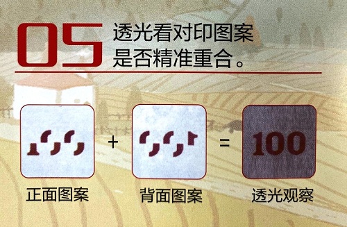 对印图案在票面正面左下方和背面右下方,透光观察,其正背面图案会组成一个完整的面额数字“100”、“50”、“20”、“10”、“5”,图案精准重合。