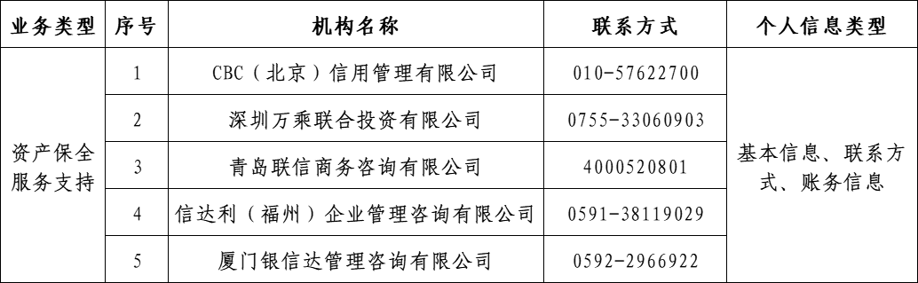 如您未依约还款或存在其他未偿还的个人贷款,我行将可能委托合法设立的第三方单位向您催缴欠款。我行将根据法律法规并参照行业最佳实践,不断完善和提升对您个人信息的安全保障水平。在将必要的个人信息提供给第三方前,我行将尽商业上合理的努力评估该第三方收集信息的合法性、正当性、必要性。我行会与第三方签订相关法律文件并要求第三方处理您的个人信息时遵守法律法规和签署的法律文件,要求第三方对您的信息采取保护措施。受委托第三方清单如下: